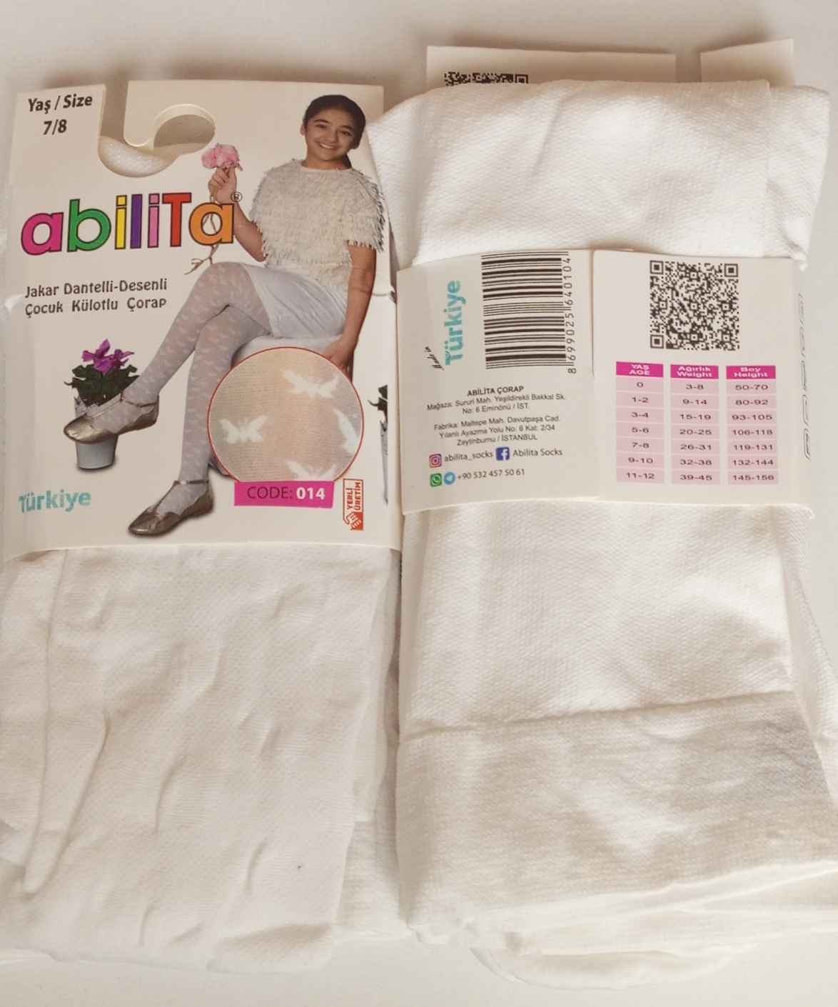 Kelebek desenli muz kilotlu çorap beyaz 2'li 7-8 yaş